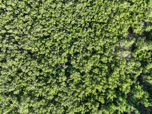 Aerial top view of mangrove forest. Drone view of dense green mangrove trees captures CO2. Green trees background for carbon neutrality and net zero emissions concept. Sustainable green environment.
