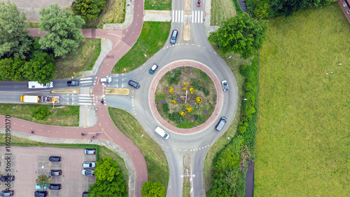Aerial topshot from a roundabout with traffic in the Netherlands