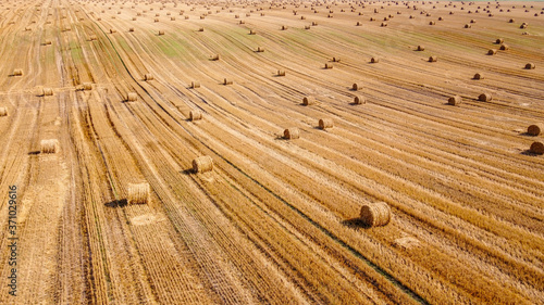 Aerial view at a wide agricultural field with many bales of straw on it.