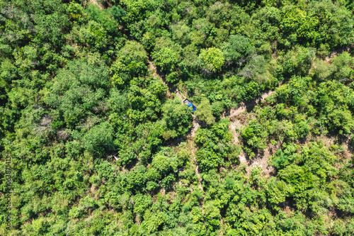 Aerial view captures a lush, green forest with a dense canopy of trees stretching across the landscape.