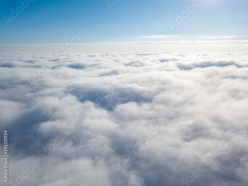 Aerial view. Flying over white clouds during the day in sunny weather.