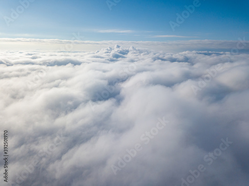 Aerial view. Flying over white clouds during the day in sunny weather.