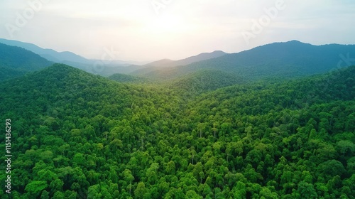 Aerial View forest idea. Aerial view of a lush green landscape with mountains and soft sunlight in the background.