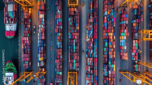 Aerial view harbor, cargo ship, container, loading, night, logistics, import, export, global trade