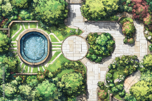 Aerial view of a beautiful garden design featuring a circular pool and stone pathways surrounded by lush greenery