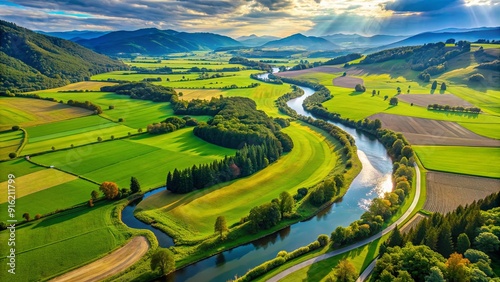 Aerial view of a beautiful valley with a winding river and lush green fields, aerial, view, valley, river, lush, green