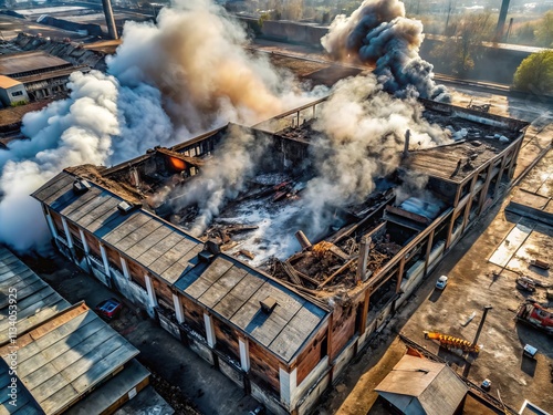 Aerial View of a Burnt Warehouse with Smoke Clouds Billowing from the Rooftop, Capturing the Aftermath of a Fire Disaster in a Macro Photography Style