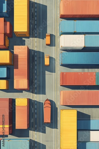 Aerial view of a bustling port with stacked shipping containers and docked vessels
