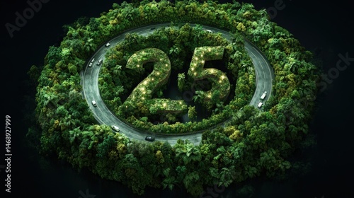 Aerial view of a circular park featu a large green number 25 formed by landscaped vegetation with a winding road and lush trees surrounding the monument