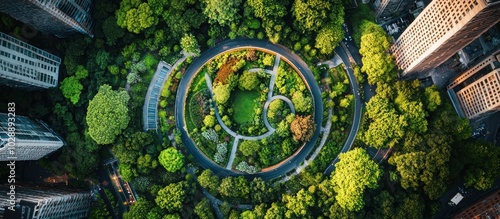 Aerial view of a circular park with a road and trees in the middle of a city.