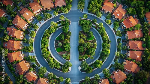 Aerial view of a circular residential neighborhood with homes and greenery.