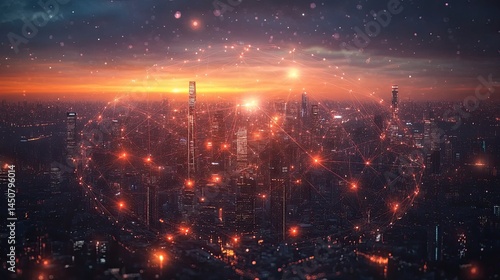 Aerial view of a city skyline at dusk with network connections and glowing lights connecting buildings