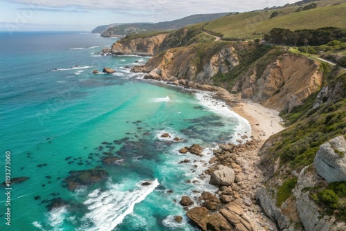 Aerial view of a coastline with rocky cliffs and turquoise waves crashing against the shore at low tide, sea, shoreline