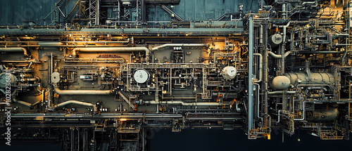 Aerial view of a complex industrial facility with intricate network of pipes, tanks, and machinery.