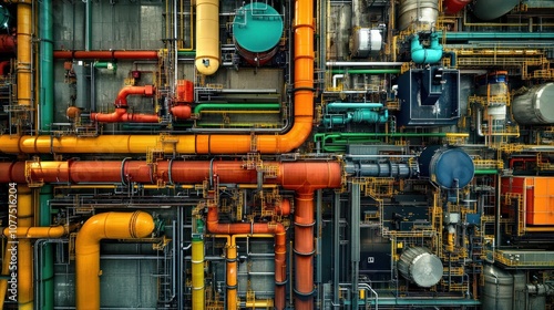 Aerial View of a Complex Industrial Piping System with Colorful Pipes and Tanks