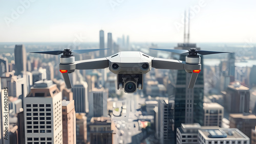 Aerial view of a drone flying over a city skyline during the day