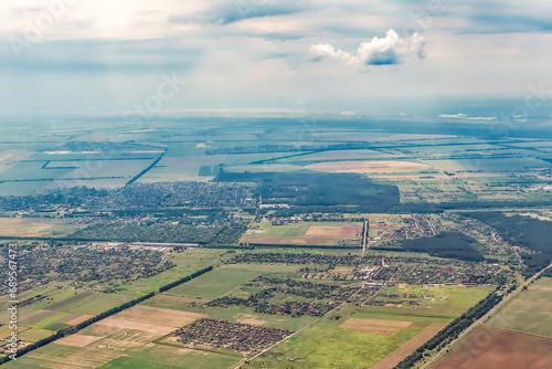 Aerial view of a flat landscape in Ukraine. City and roads among fields and forests - view from a drone. Local map