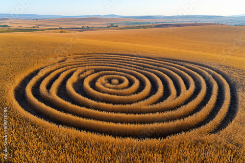Aerial view of a flawless spiral crop circle meticulously formed in a vast wheat field, surrounded by rolling countryside and clear skies