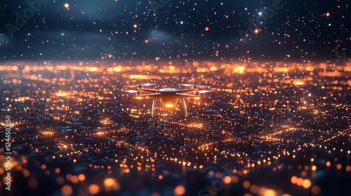Aerial view of a futuristic city at night, illuminated by glowing lights, showcasing advanced technology and urban design against a starry sky.
