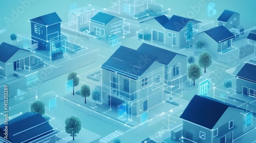 Aerial view of a futuristic smart neighborhood with digital overlays and interactive features