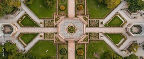Aerial View of a Geometrically Designed Garden with Paths, Ponds, and Trees