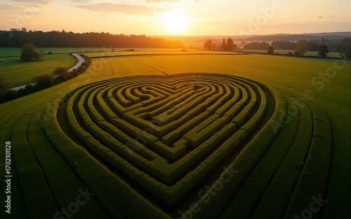 Aerial View of a Heart Shaped Maze in a Field at Sunset. High quality