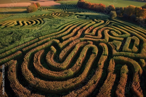 Aerial view of a large, intricate corn maze surrounded by green fields and autumn trees in the countryside during daytime.