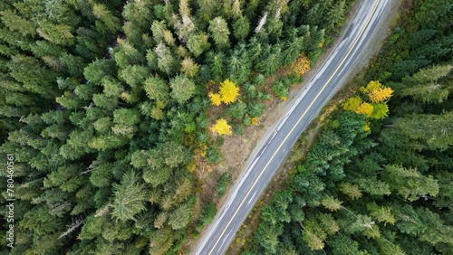 Aerial view of a long and narrow road through the dense forest with high green trees in Pemberton