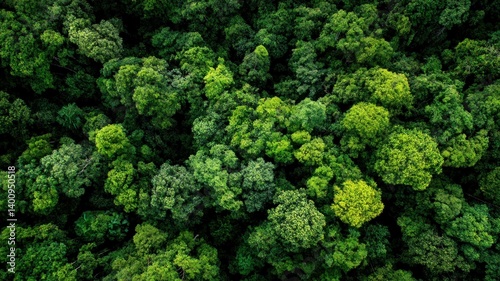 Aerial view of a lush, green forest canopy showing vibrant treetop foliage.