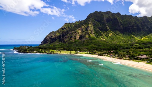 Aerial View of a Lush Green Mountain Overlooking a Tropical Beach and Turquoise Ocean.