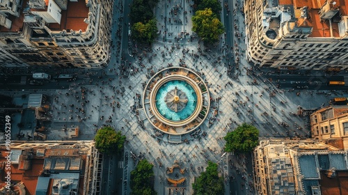 Aerial view of a majestic European plaza, focusing on a grand circular fountain at its center, elegant symmetry, bustling with people and vintage architecture