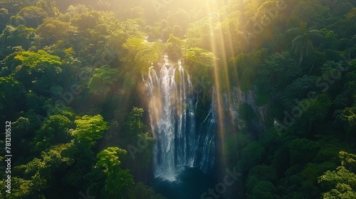 Aerial view of a majestic waterfall in a dense forest, drone capturing