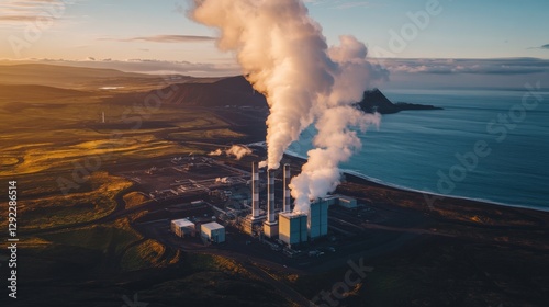 Aerial view of a power plant emitting steam, surrounded by mountains and ocean at sunset