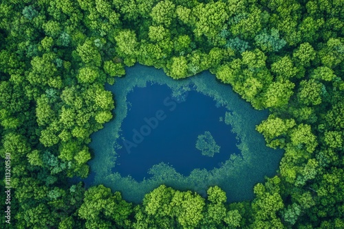 Aerial view of a secluded lake surrounded by lush green forest.