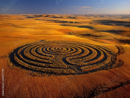 Aerial view of a spiral maze carved into a dry, golden field under a vast sky