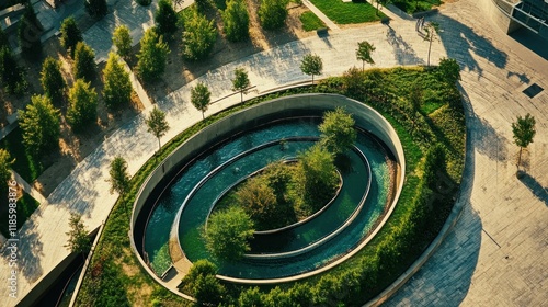 Aerial view of a spiral water feature in a park with surrounding trees and walkways.