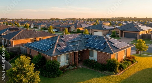 Aerial view of a suburban neighborhood with houses fitted with solar panels at golden hour lighting