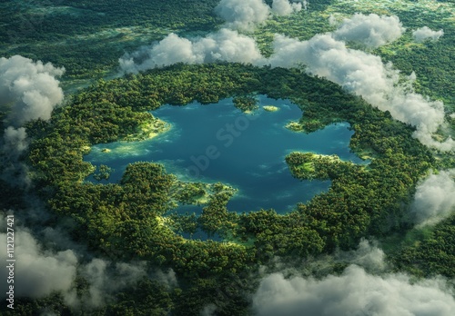 Aerial View of a Tropical Island Surrounded by Lush Green Forest and Misty Clouds Reflecting Serenity in Nature’s Paradise