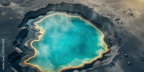 Aerial View of a Turquoise Geothermal Hot Spring Surrounded by Volcanic Rock.