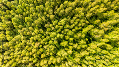 Aerial view of a vibrant green forest showcasing a dense canopy of trees during the spring season. The sunlight filters through, creating a pattern of light and shadow.