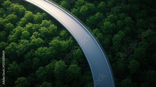 Aerial view of a winding highway surrounded by lush green trees, showcasing the harmony of infrastructure and nature