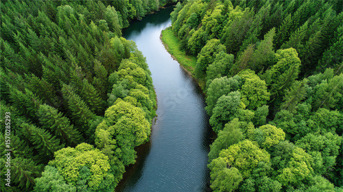 Aerial view of a winding river surrounded by lush green forests, showcasing the beauty of nature and the tranquility of the environment.