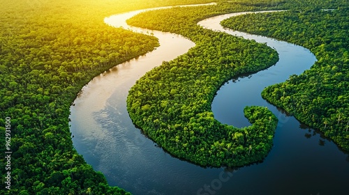 Aerial View of a Winding River Through Lush Rainforest