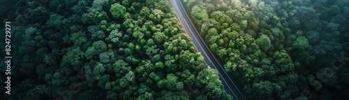 Aerial view of a winding road cutting through lush green forest, captured in stunning daylight, depicting nature's beauty and tranquil scenery.