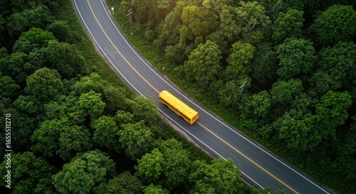 Aerial view of a yellow school bus driving along a winding road through a dense green forest.