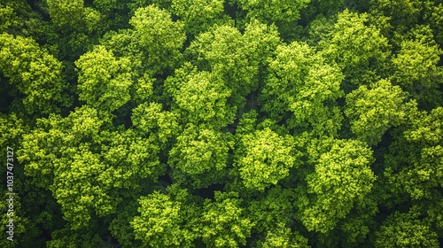 Aerial view of a young green forest, springtime foliage with lush greenery, sunlight filtering through the leaves
