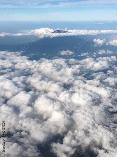 Aerial view of Agung volcano peak in Bali from plane window. Cloudy beautiful weather.