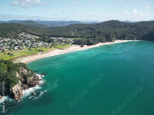 Aerial view of an isolated island on a sunny day. Onemana beach, whangamata