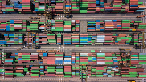 Aerial view of area with stacked containers at the port, Top view stack of freight containers in rows at the shipyard, Global business cargo logistics shipping industry export import transportation.
