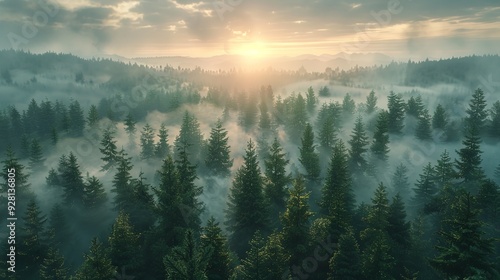 Aerial view of Beautiful nature landscape with mountains and pine tree with sunrises, generated by AI